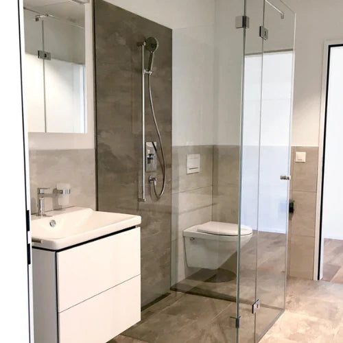 Step into a bathroom that gleams — crystal-clear glass, gleaming taps, a spotless mirror.